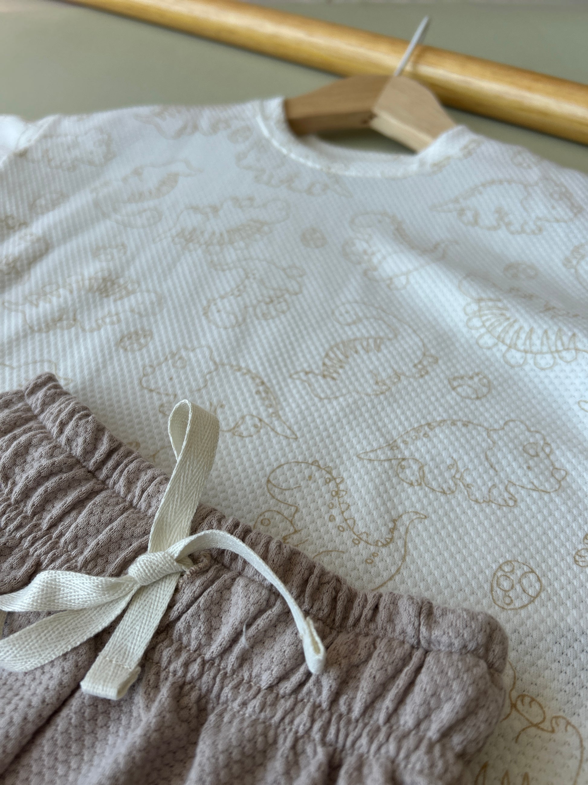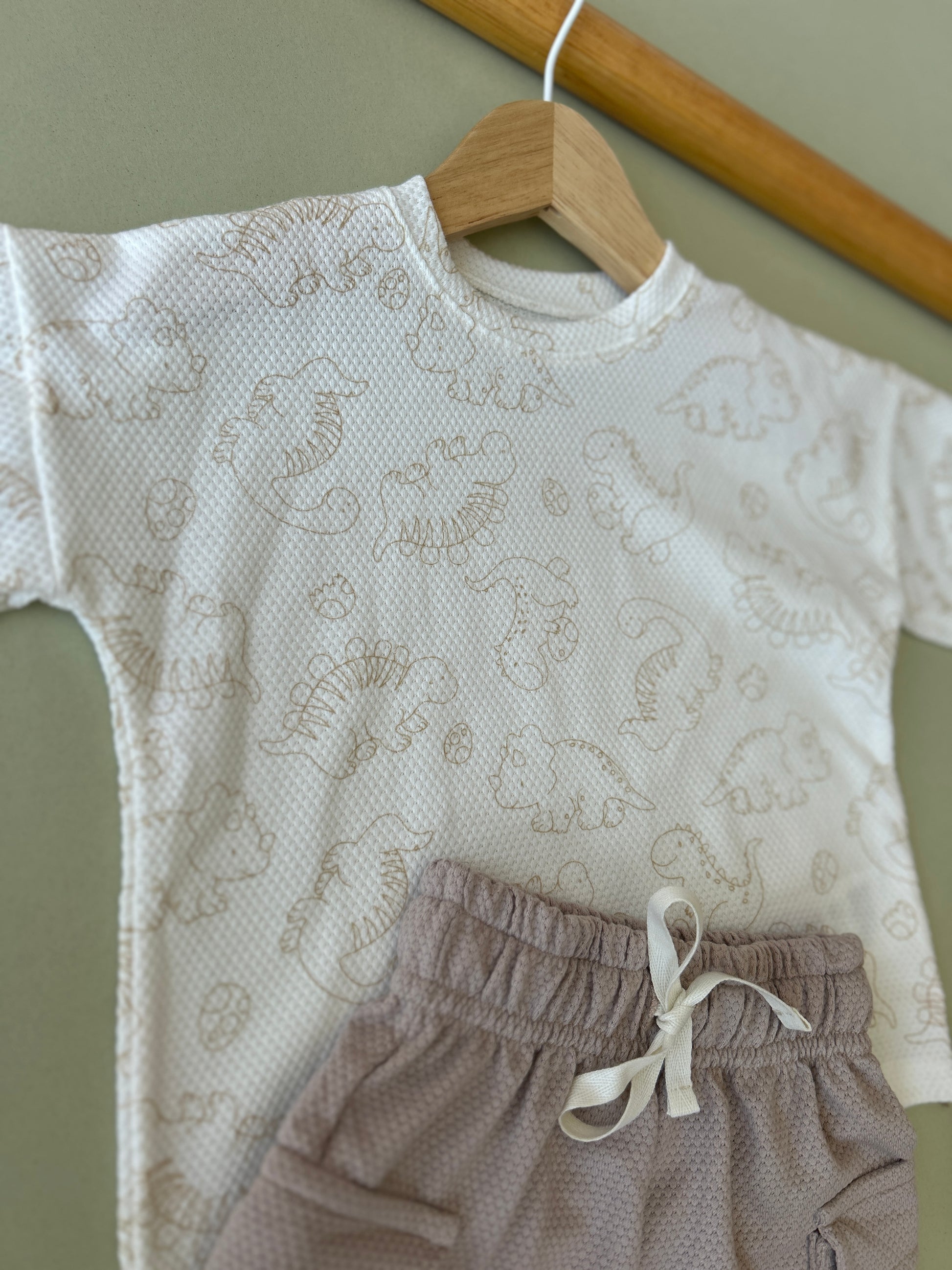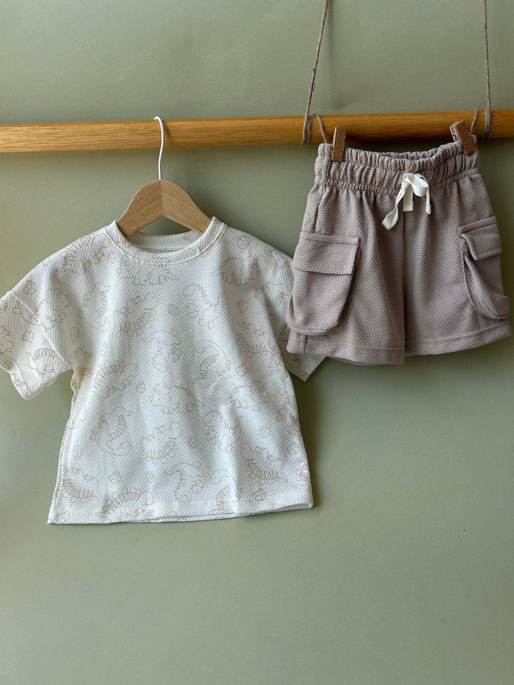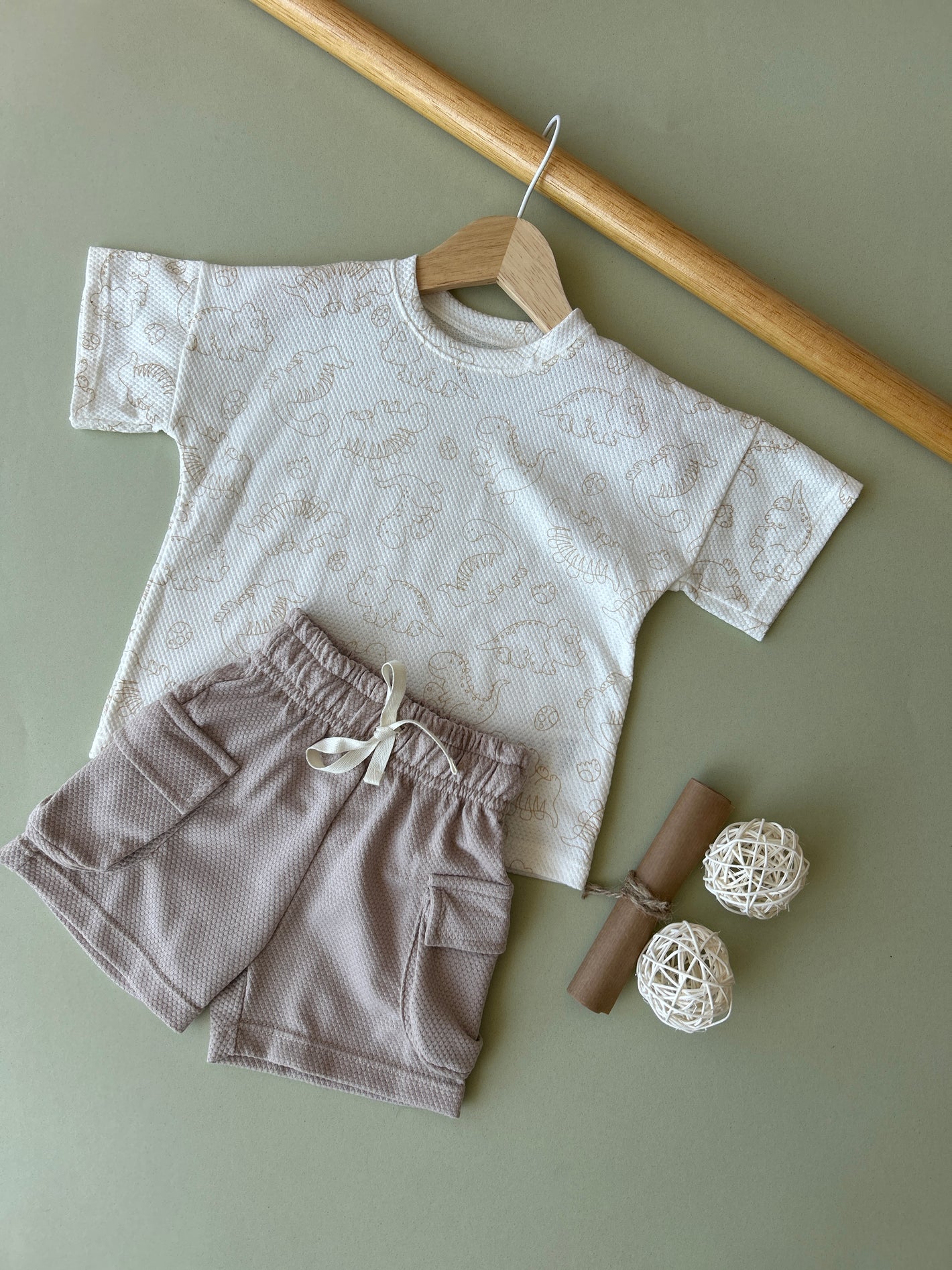Este conjunto incluye una camiseta ligera con estampado de T-Rex y un short con bolsillos tipo cargo, perfecto para explorar, jugar y mantenerse cómodo todo el día.