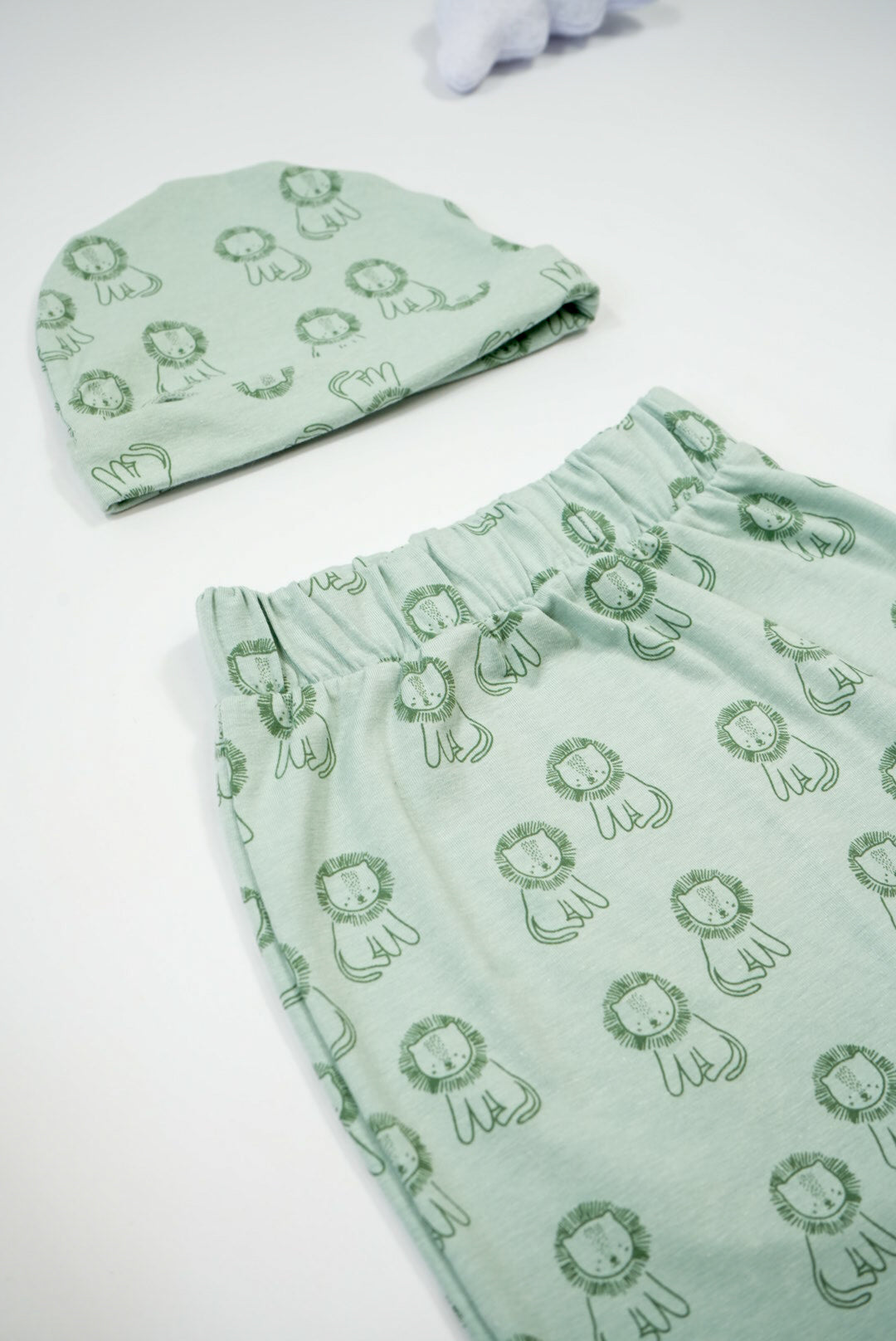El Set Brave Cub es una pijama diseñada para brindar máxima comodidad durante el descanso de tu bebé. Incluye un body con un valiente león estampado 🦁, acompañado de un pantalón suave y un gorrito verde que completa el look con ternura y calidez 💚.